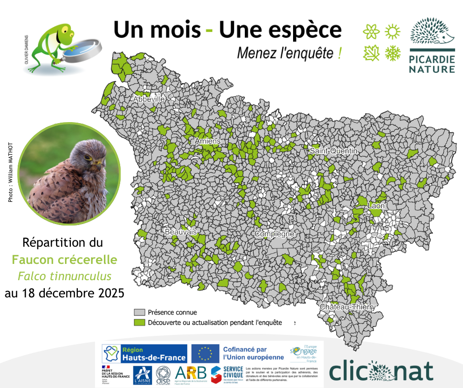 C’est donc sur 213 communes en Picardie que le Faucon crécerelle a été observé en novembre et décembre 2025. Si vous rencontrez encore cet oiseau, vous pouvez toujours nous avertir en saisissant vos observations sur https://clicnat.fr/.