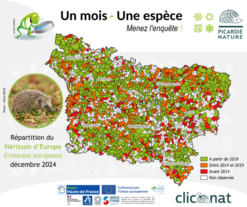 Aidez-nous à peaufiner la répartition du Hérisson d’Europe en Picardie, en participant à l’enquête ! Nous comptons sur vous pour verdir la carte de répartition de ces espèces.