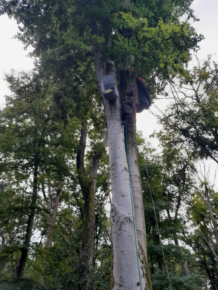 Au Bois Hariez, 4 femelles de Murin de Bechstein ont été équipées chacune d’un minuscule émetteur radio (environ 150 MHz), collé avec une goutte de colle chirurgicale. Au Taillis d’Ivors, la femelle équipée a perdu son émetteur, retrouvé le lendemain parcelle 1504, il sera réutilisé. Au Bois Hariez, on remarque que les femelles équipées appartiennent à 2 populations, qui se croisent aux mares de la future Réserve Biologique Intégrale. Leurs signaux radio ont conduit plusieurs fois à des arbres-gîtes atypiques, pour cette espèce, en termes d’essence (pas que des Chênes), de diamètre (à partir de 25 !) et d’accessibilité (chandelles ou charpentières cassées). Les arbres-gîtes grimpables ont été escaladés pour capturer et étudier tous les individus quand ils sortent du gîte. L’état sanitaire de la population est alors estimé.